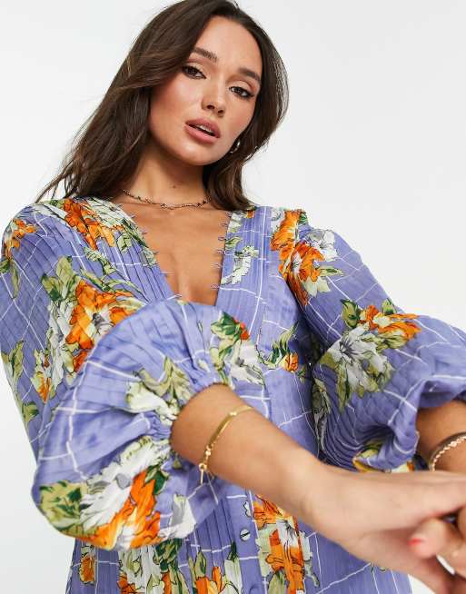 Product Name: Lilac floral print high frill neckline pleated dress top